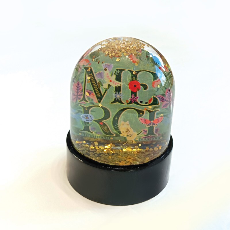 A delicate and inspiring small glitter globe. Filled with softness, it reveals the message 'Merci infiniment pour tout' in a golden swirl. A thoughtful gift of gratitude. A poetic piece to display or collect.