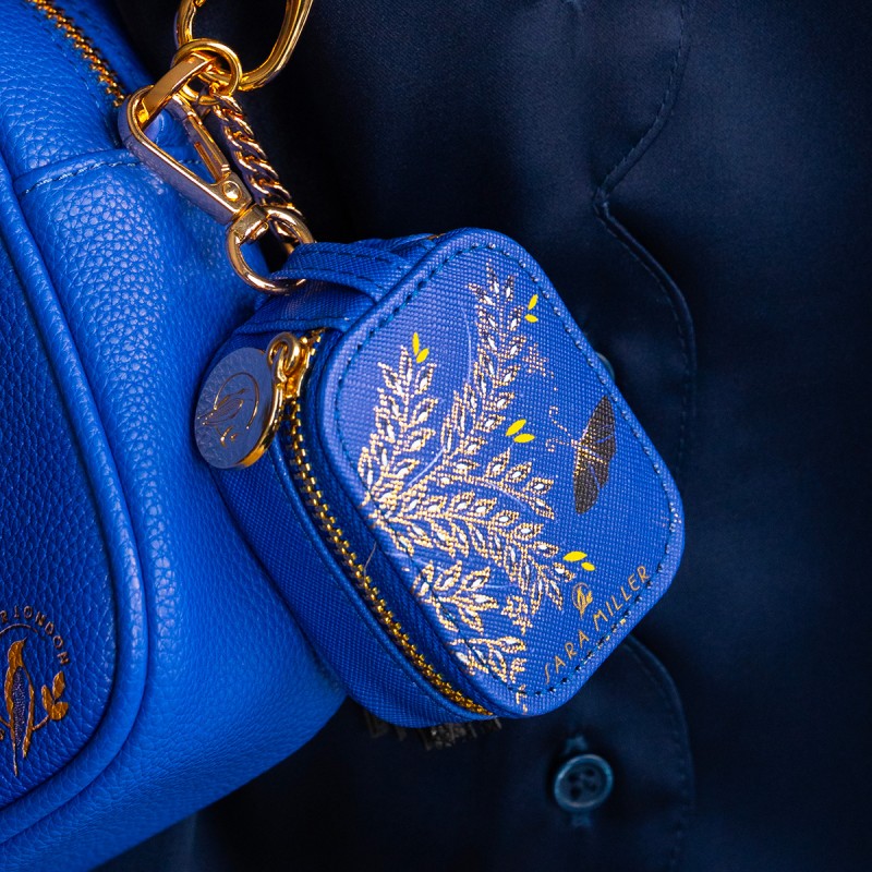 Pochette à écouteurs de la Birthday Collection Sara Miller. Un accessoire compact en cuir vegan bleu, souligné de détails dorés.